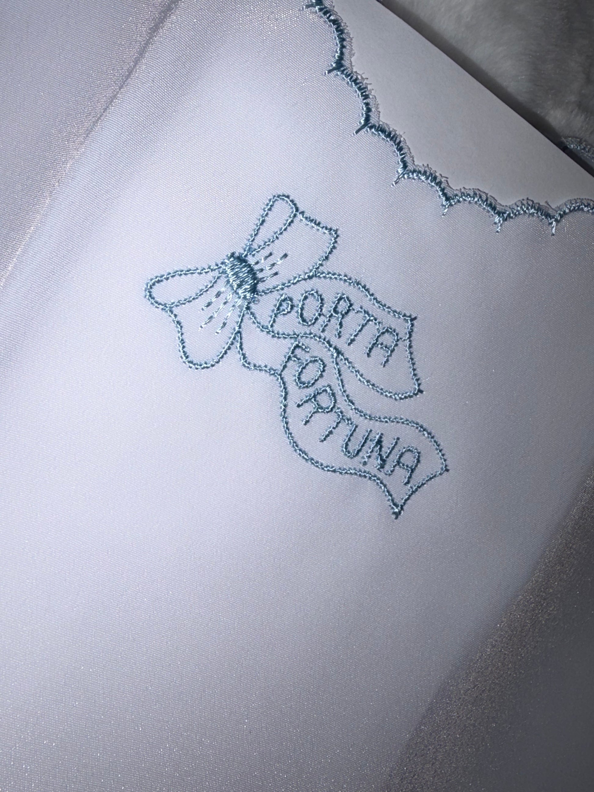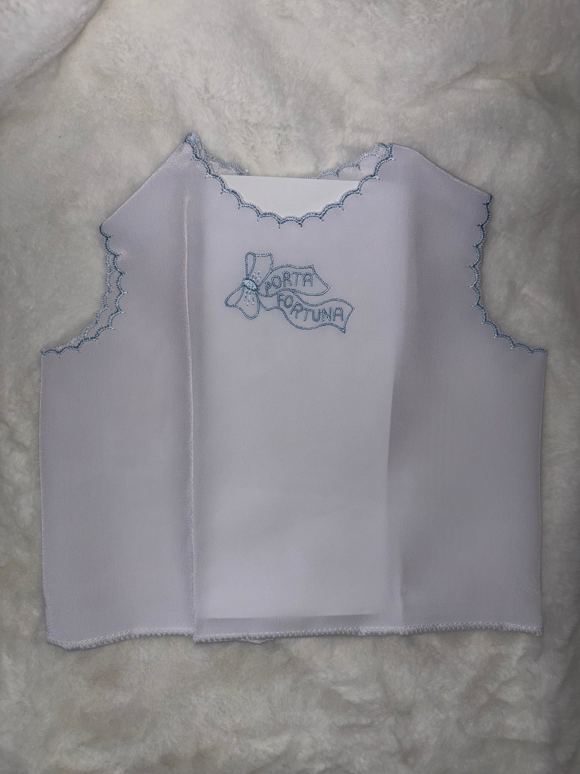Camicina “porta fortuna” In bianco con ricami azzurri.
