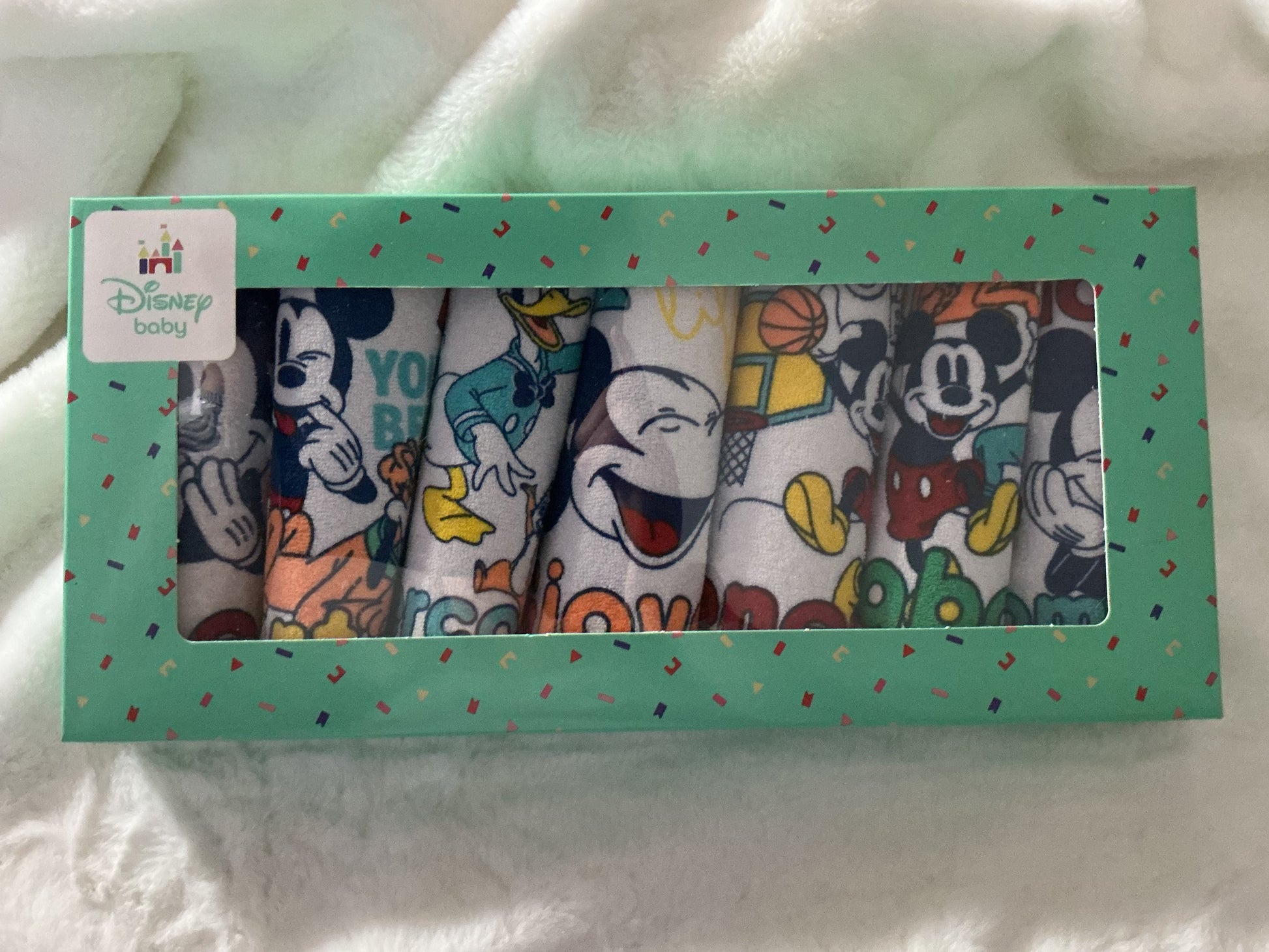 7 Bavaglini in spugna plastificata con stampa Topolino e Paperino e i giorni della settimana.