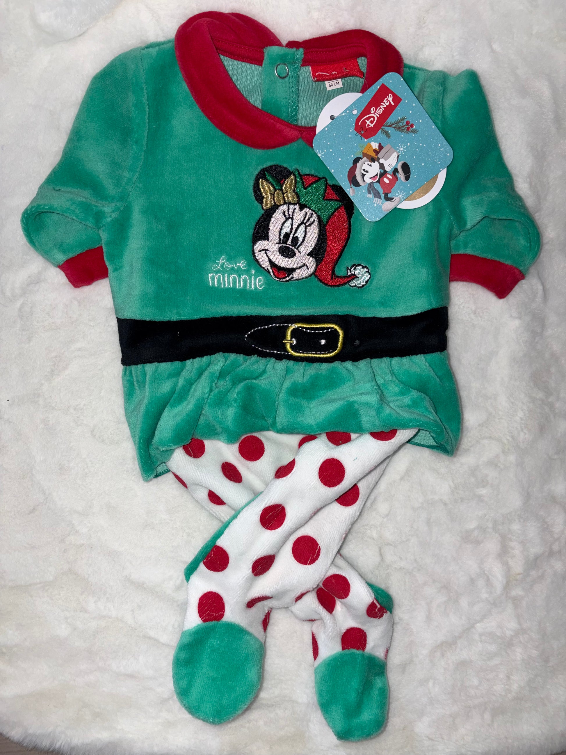 Tutina Baby Minnie in morbida CINIGLIA e COTONE finemente RICAMATA " MINNIE NATALE " con comode aperture a "clips ".